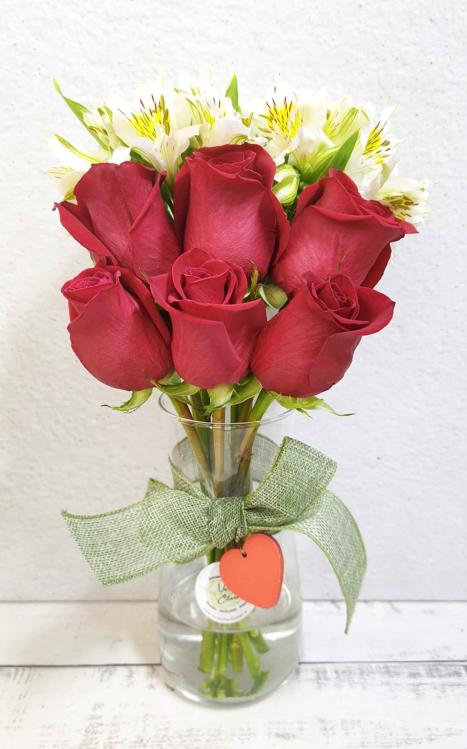 Hermoso florero de vidrio con corazón de madera rojo más 6 rosas rojas importadas y alstromelias que sorprenderán a quien más quieres. Incluye bolsa kraft de regalo