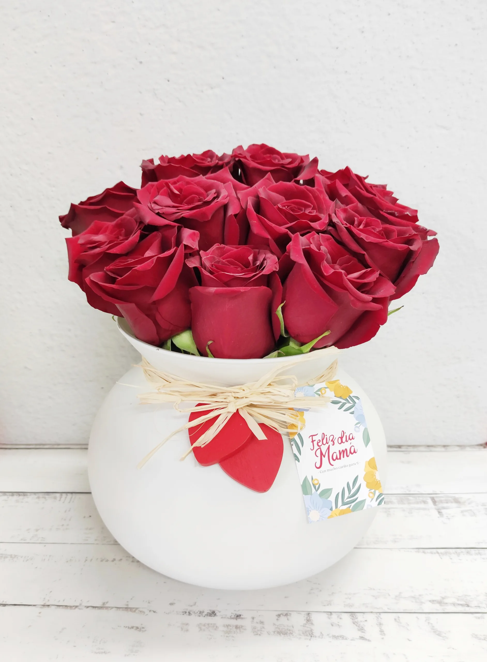 Base de madera en tonos blancos con 6 rosas importadas más follaje que quedarán en perfecta armonía con alstromelias, Gypso y margaritas, según disponibilidad semanal!