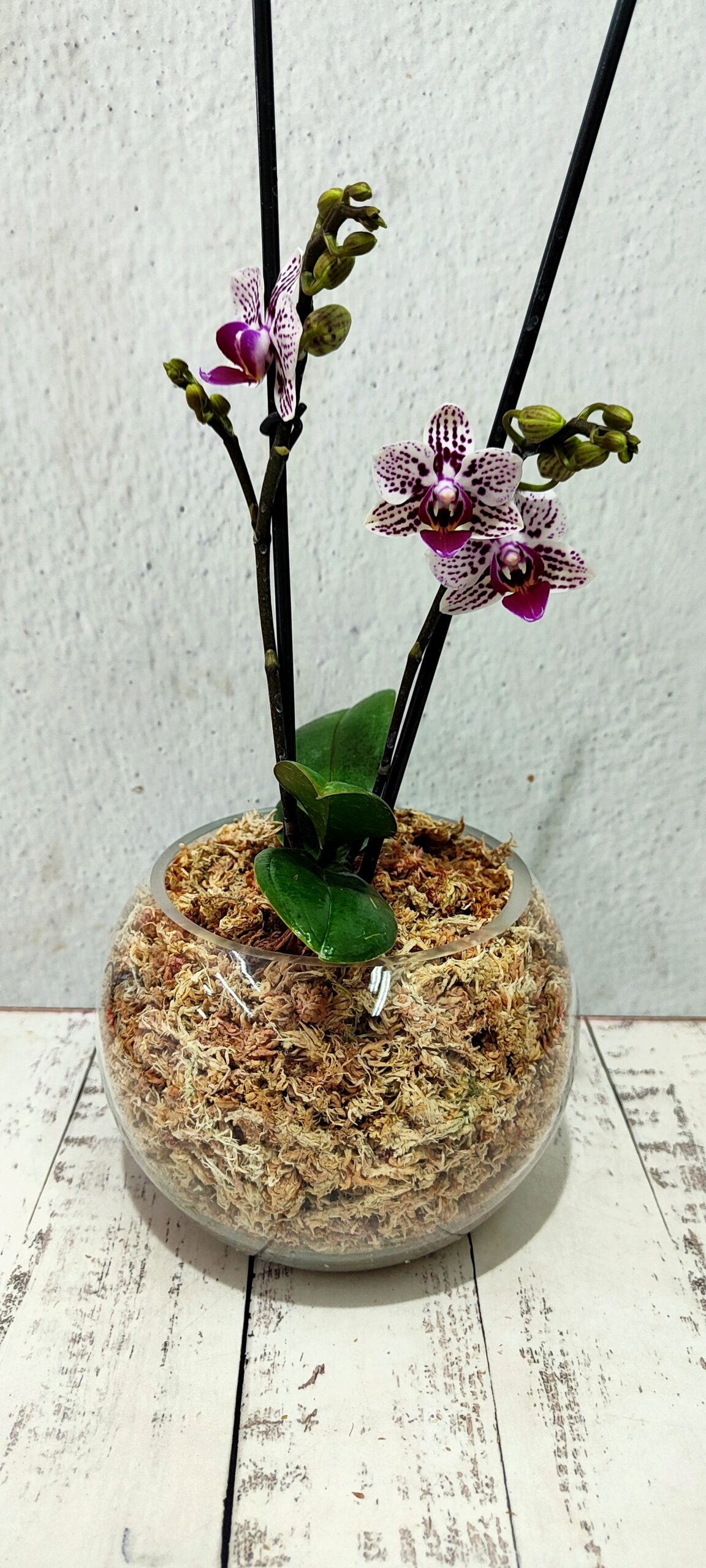 Hermosa Orquídea 🌸 plantada en pecera de vidrio transparente con sustrato especial, sus llamativas flores aportan un toque de color en la decoración de tu hogar.