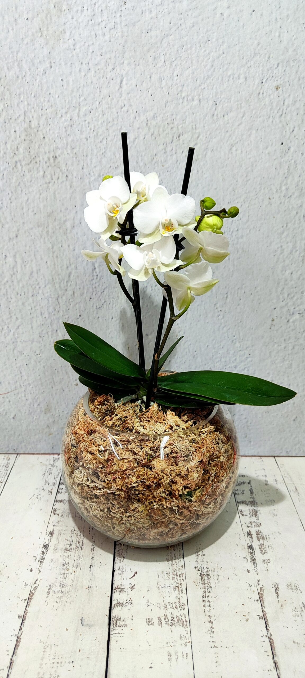 Hermosa Orquídea 🌸 plantada en pecera de vidrio transparente con sustrato especial, sus llamativas flores aportan un toque de color en la decoración de tu hogar.