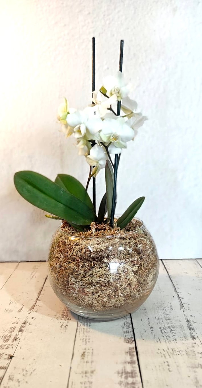 Hermosa Orquídea 🌸 plantada en pecera de vidrio transparente con sustrato especial, sus llamativas flores aportan un toque de color en la decoración de tu hogar.