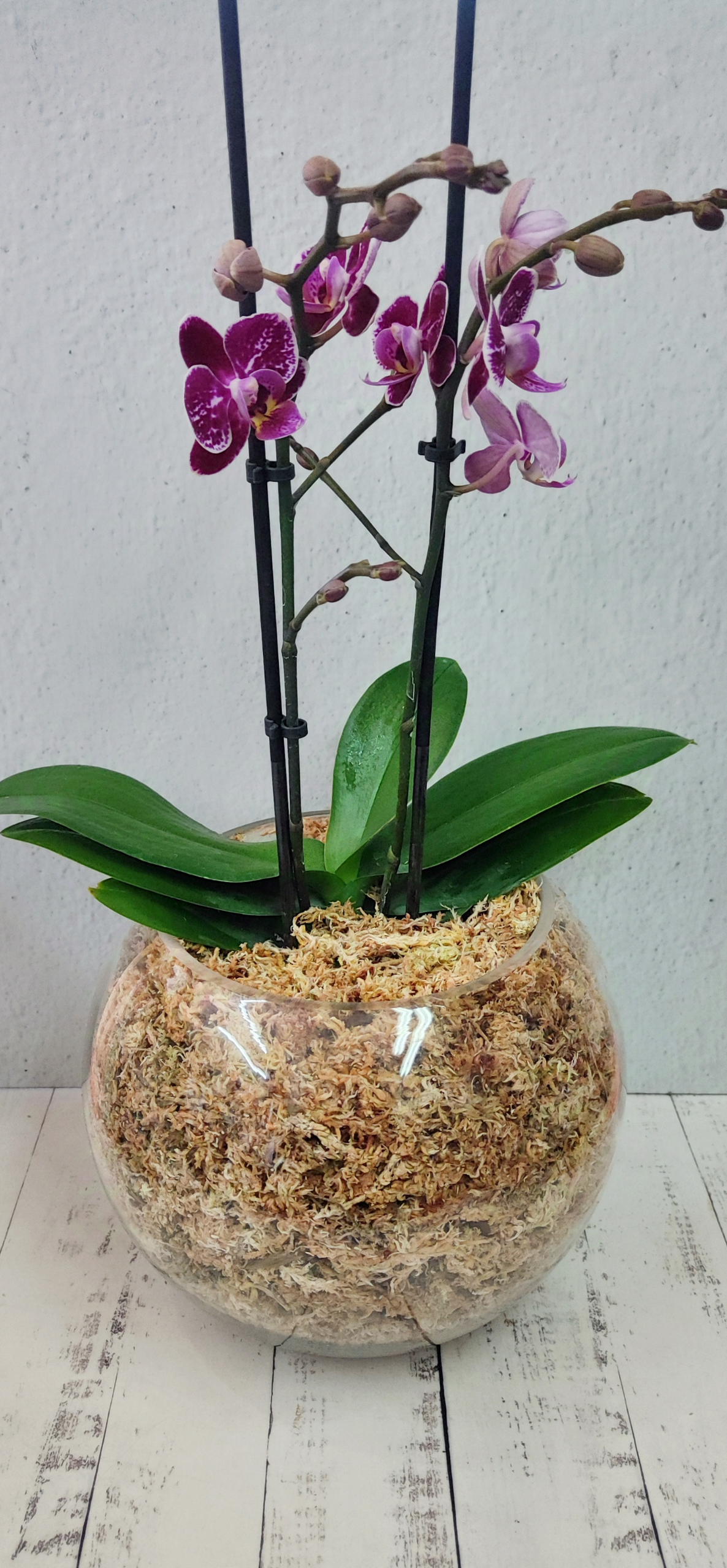 Hermosa Orquídea 🌸 plantada en pecera de vidrio transparente con sustrato especial, sus llamativas flores aportan un toque de color en la decoración de tu hogar.