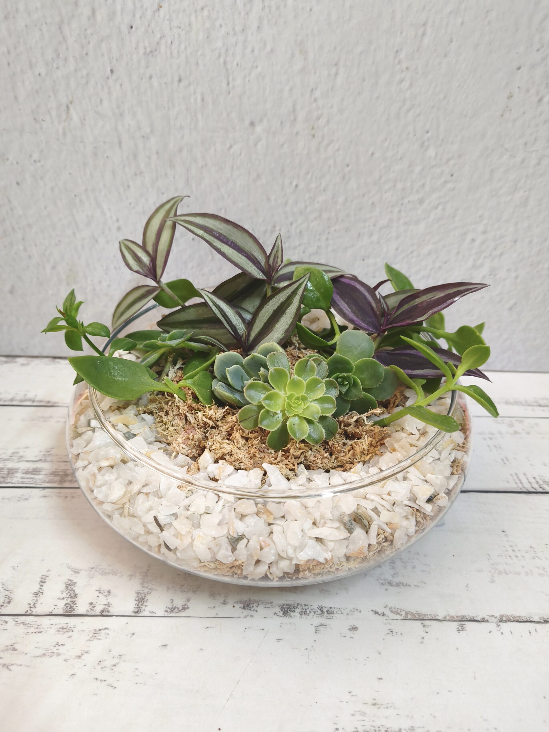 Hermoso y novedoso terrario de vidrio con bordes en metal blanco medidas de 24 cm de largo x 13 cm de ancho x 19 cm de alto. Incluye lindas suculentas y cactus con diferentes adornos en piedras de diferentes colores.