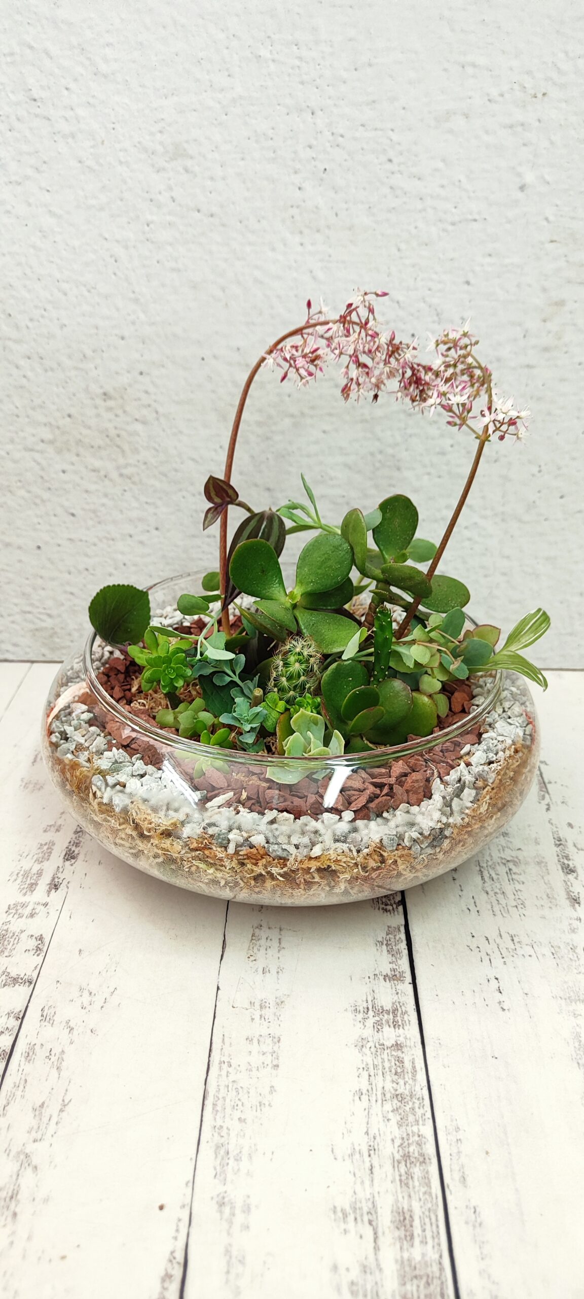Hermoso y novedoso terrario de vidrio con bordes en metal blanco medidas de 24 cm de largo x 13 cm de ancho x 19 cm de alto. Incluye lindas suculentas y cactus con diferentes adornos en piedras de diferentes colores.